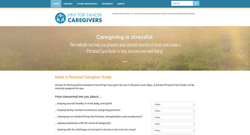 This interactive website helps family caregivers care for their own health and well-being since caring for a loved one with cancer is stressful. It helps caregivers pinpoint current sources of strain and creates a Personal Care Guide to help with issues like depression and anxiety, coping with emotions, and even managing money issues.